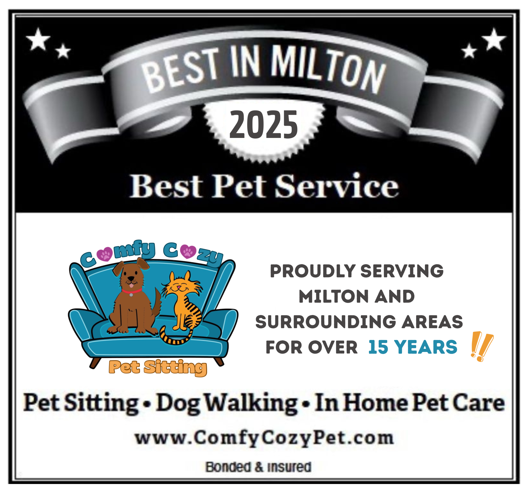 “Comfy Cozy has been the best pet sitting service I’ve used over the past 10 years… Thrilled to have found them when I moved to Milton!” Rosemary A.- “Sapa”